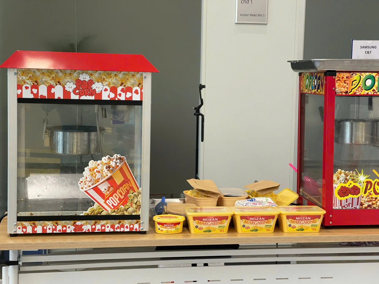 Sử dụng máy rang bắp chuyên dụng, cho hạt nở đều, không khét, tạo mùi thơm hấp dẫn lan tỏa cả không gian sự kiện.